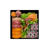1 sake roll (8 pezzi), 1 maguro roll (8 pezzi), 1 golden cruch roll (8 pezzi), 1 yume roll (8 pezzi), 8 nigiri a scelta dello chef (salmone, tonno, gamberi)