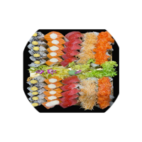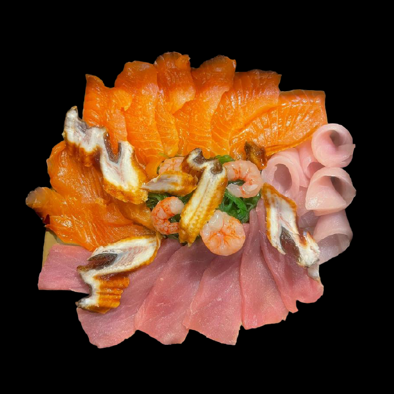 3 roll a scelta dello chef (24 pezzi), 2 hosomaki a scelta dello chef (16 pezzi), 7 fettine di sashimi a scelta dello chef, 3 calamari panko, 3 gamberi croccanti con cereali, 18 nigiri a scelta dello chef