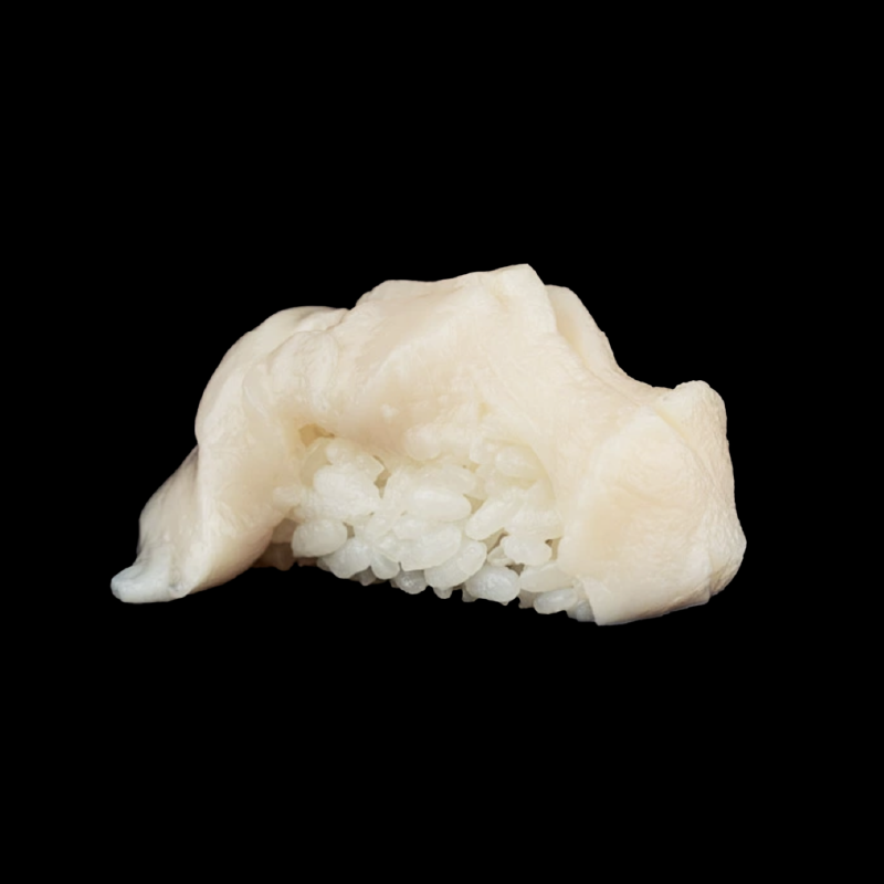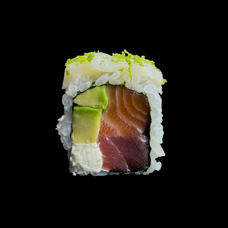 Tonno, salmone, Philadelphia e avocado, con topping di capasanta flambata con limone e hondashi