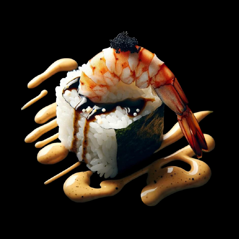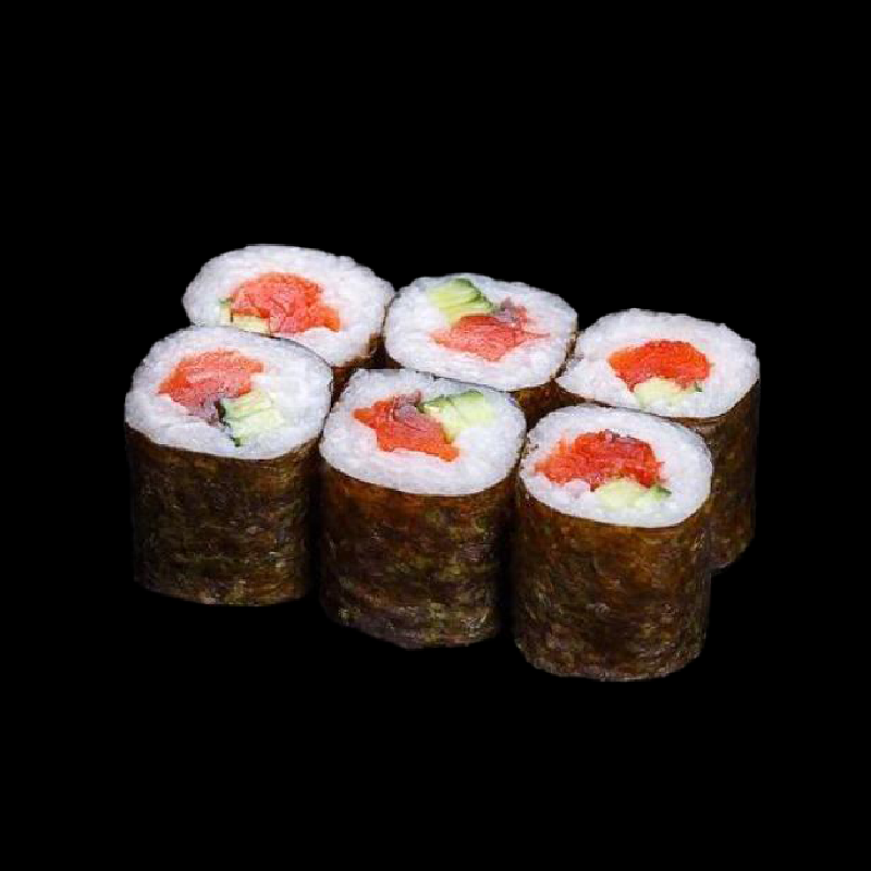 1 sake roll (8 pezzi), 1 maguro roll (8 pezzi), 6 gamberi croccanti con cereali