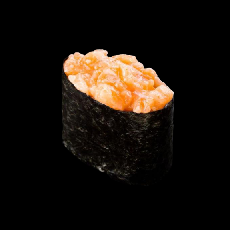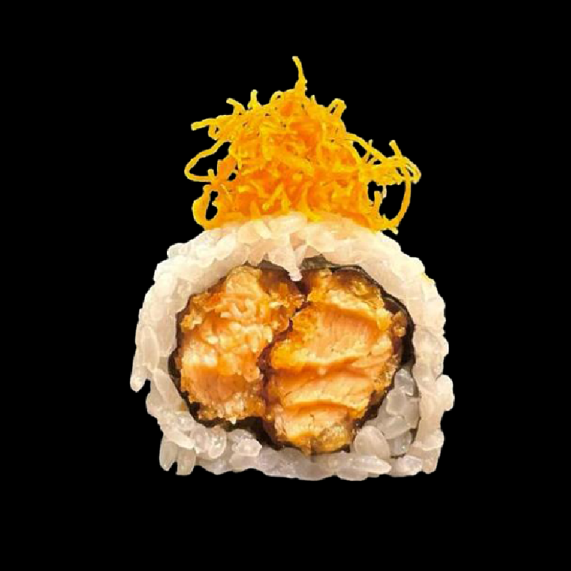 Gamberi fritti, salmone, Philadelphia e mango, con topping di tartare di salmone condito con salsa koikuchi, masago arare e salsa all’anguilla