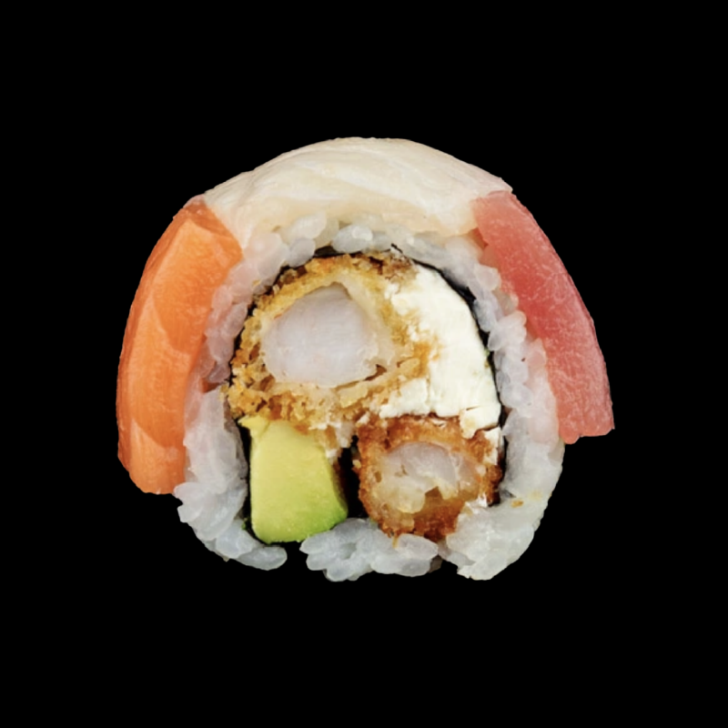 Gamberi panko, avocado e Philadelphia, con topping di salmone, tonno, pesce bianco e mango
