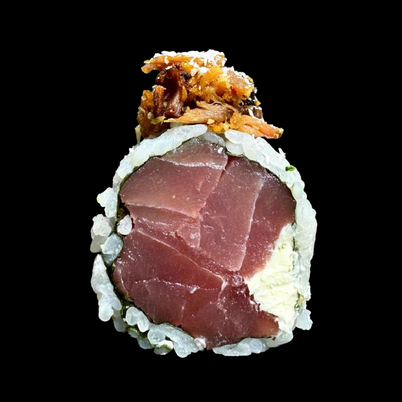 Tonno, Philadelphia al cocco e avocado, con topping di tonno cotto e marinato con salsa di anguilla