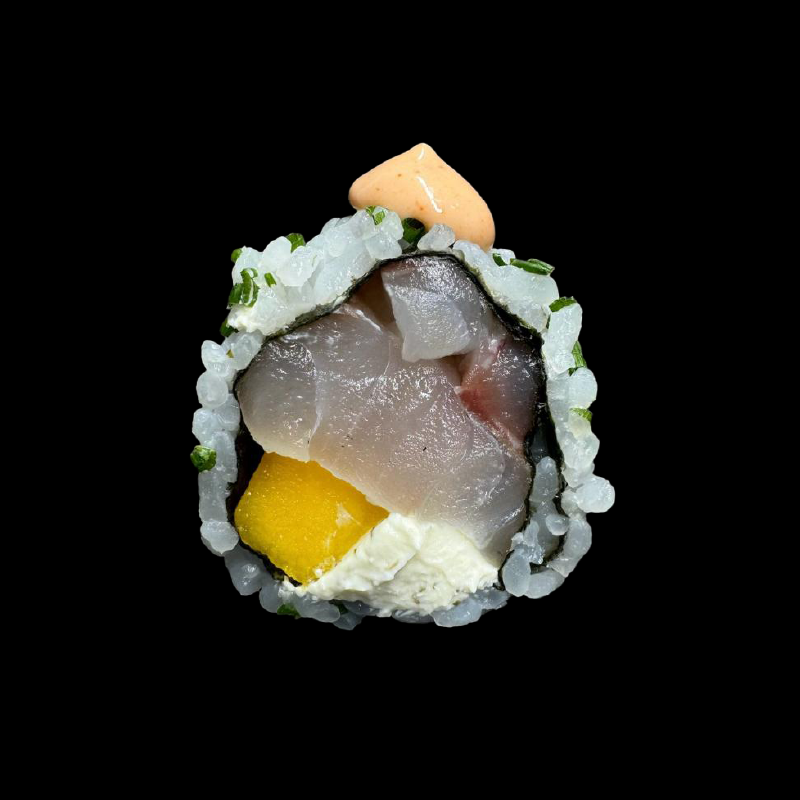 Pesce bianco, mango e Philadelphia con topping di salsa spicy ed erba cipollina