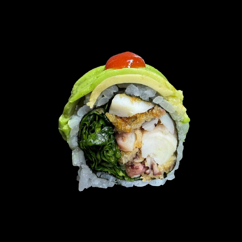 Polpo piccante in tempura, avocado, cetriolo e lattuga croccante con salsa piccante al lime