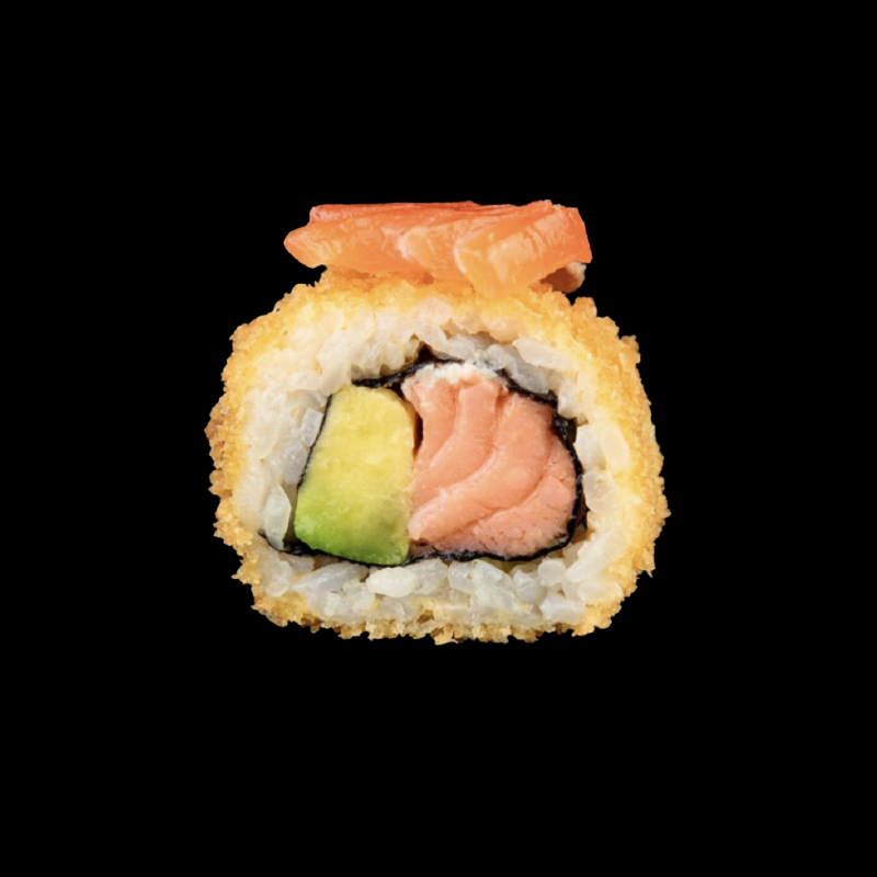 Salmone panko e avocado, con topping di salmone cotto e salsa agrodolce