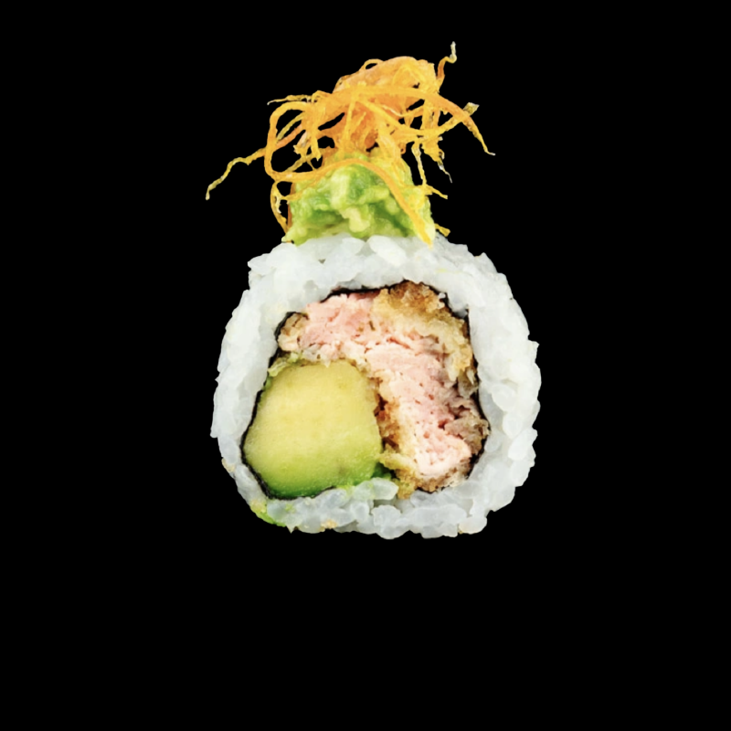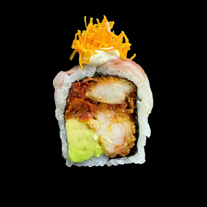 Gamberi panko, Philadelphia e avocado, con topping di tobiko mix e salsa spicy