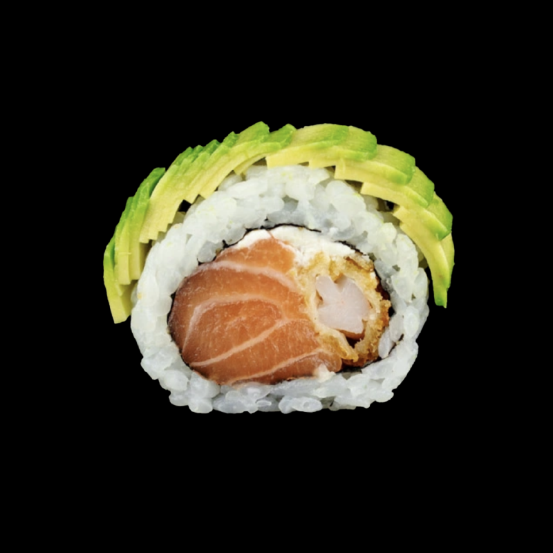Gamberi panko, Philadelphia e salmone, con topping di avocado e tobiko