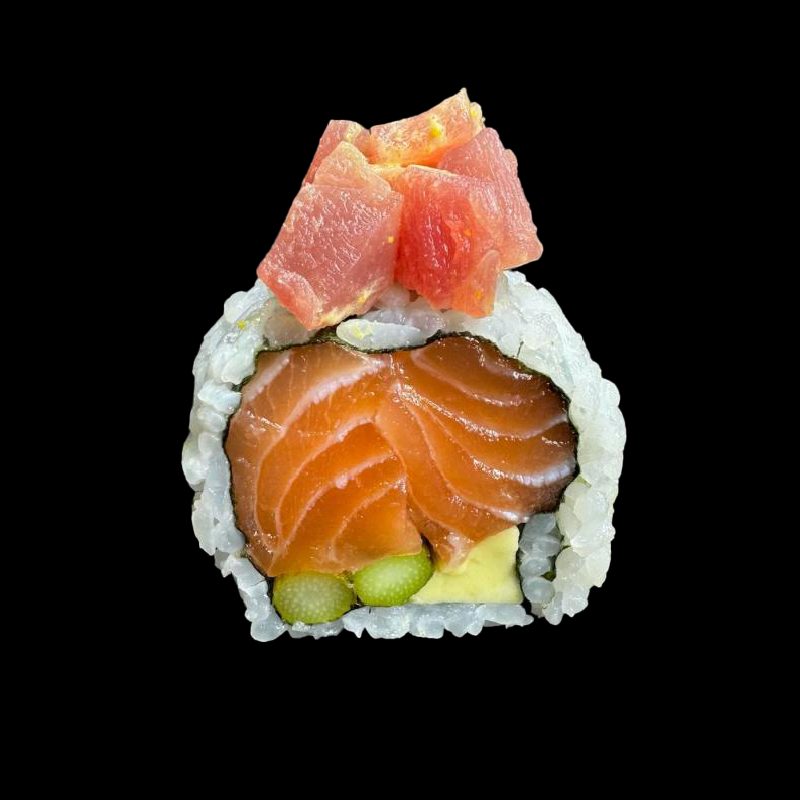 Tonno, avocado e asparagi, con topping di tonno condito con limone e mango