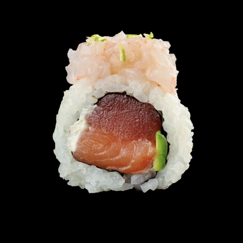 Salmone, tonno, avocado e Philadelphia, con topping di tartare di gamberi rossi e scorza di lime